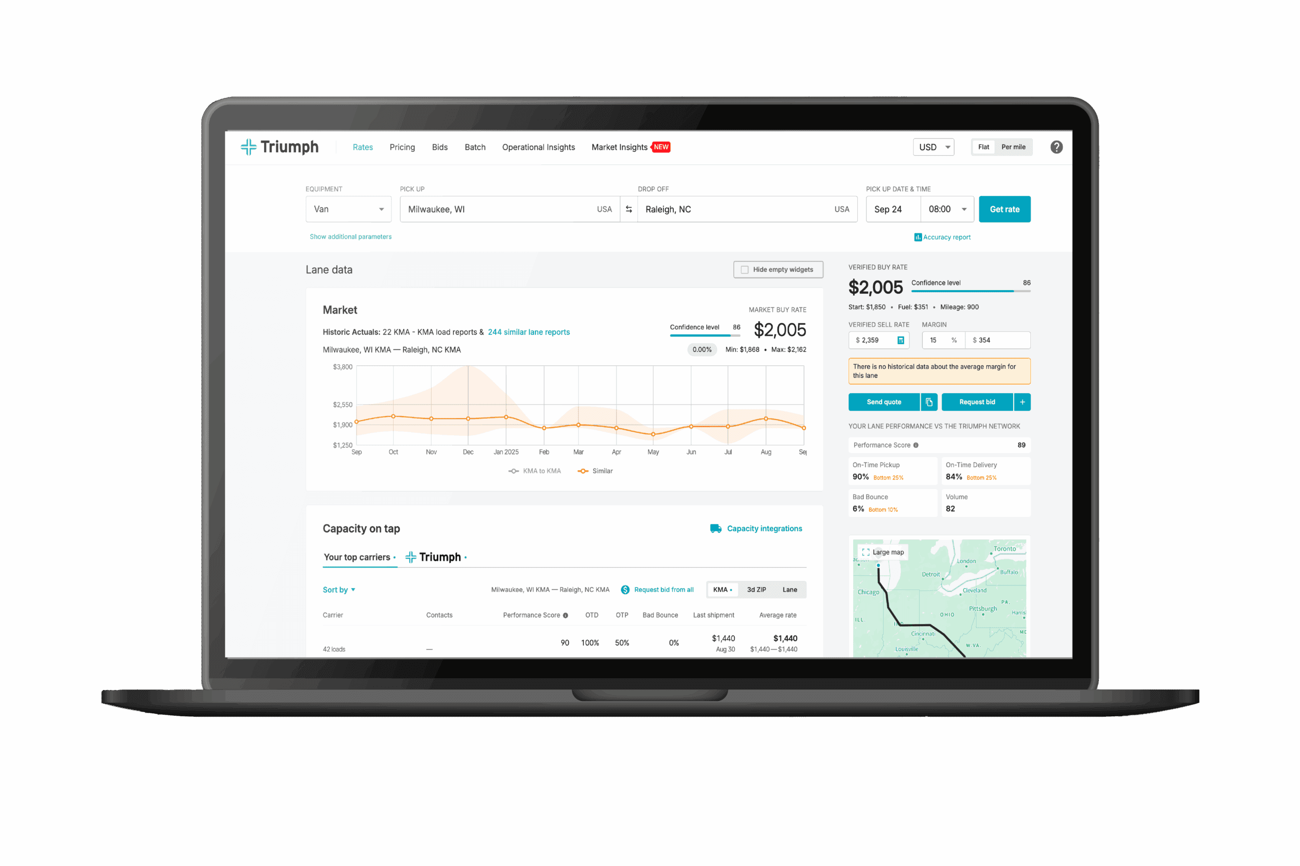 Triumph Capacity is your first-stop call list when trying to source capacity. Evaluate your network carriers based on their lane performance KPIs and the rates you’ve recently paid them. When you lack the right carrier for the job, turn to the Triumph Network for access to verified, observed capacity with performance benchmarks on every lane.